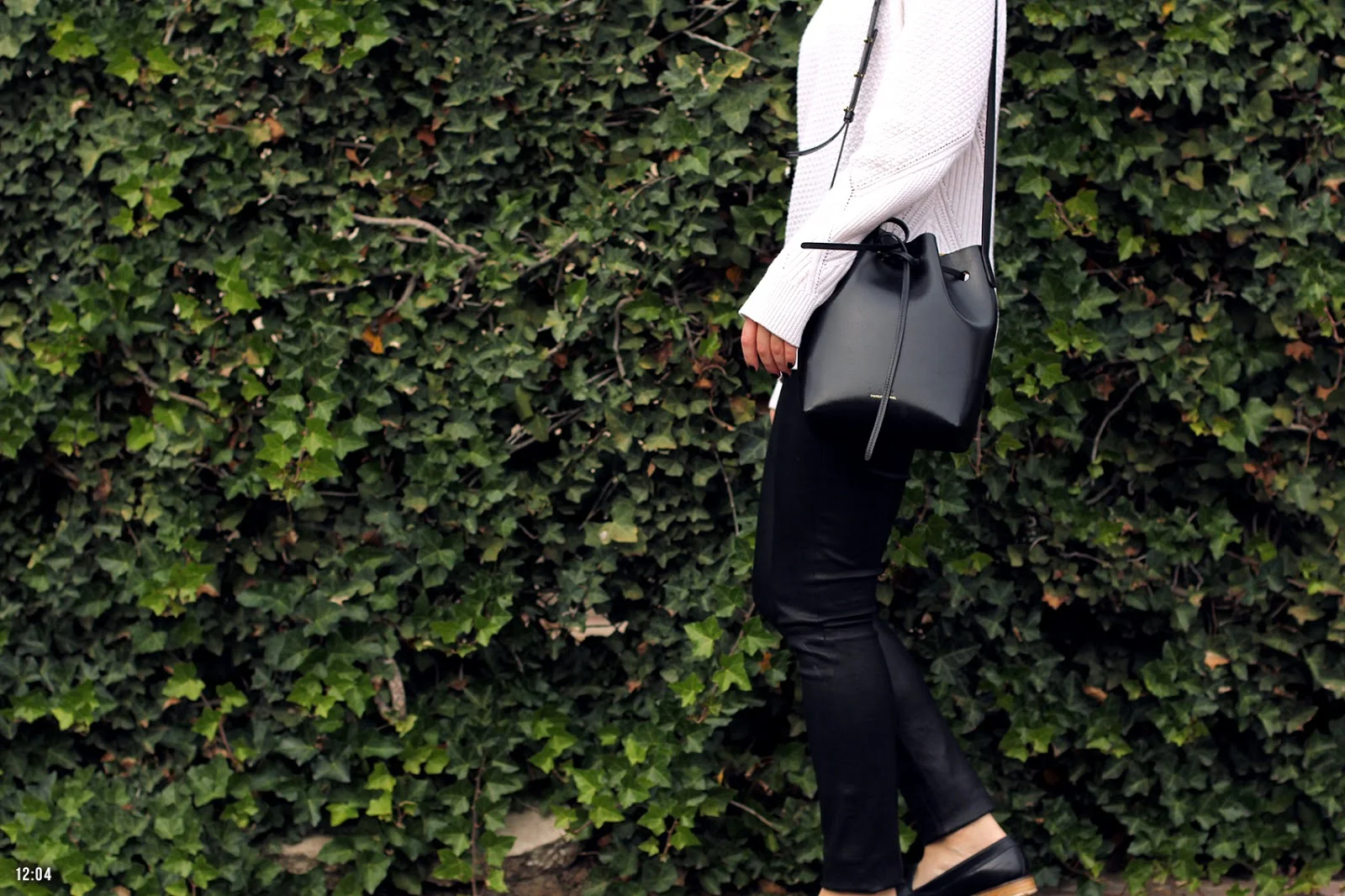 Working from home attire is pretty much leather leggings, loafers, and an oversized knit. If I happen to venture outside the house I reach for my Mansur Gavriel bucket and suddenly feel properly dressed up to see other humans long enough to hold basic conversations like, "A small coffee with room, please."